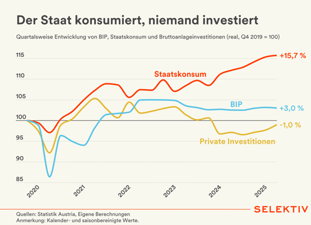 Die Spatzen pfeifen es von den Dächern: Der Staat wächst und wächst und seine Ausgaben, letztlich also der Staatskonsum, nehmen zu, die privaten Investitionen hingegen sinken. Die öffentliche Hand gibt mehr aus, als die Wirtschaft – der produzierende Teil der Gesellschaft – ihm durch Wertschöpfung und damit auch Steuersubstrat an Mitteln zur Verfügung stellt. Das kann nicht nur auf die Dauer nicht gut gehen – es geht bereits jetzt nicht gut.